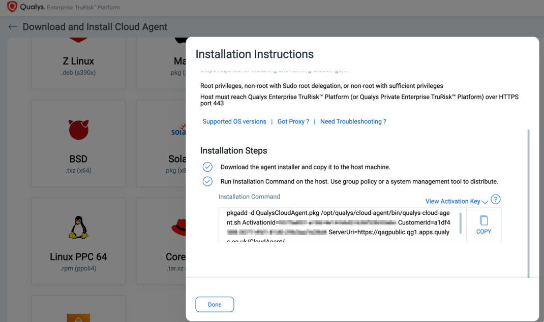 - Install the IPS-based agent package using the installation command from within the Qualys console of Cloud Agent