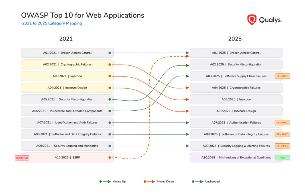 The OWASP Foundation has updated the Top 10 for Web Applications for the first time since 2021. The 2025 edition reorganizes category numbering, renames several categories, and adjusts scope. Most OWASP category identifiers (A01 through A10) will map to different vulnerability groups after the update. The vulnerabilities themselves do not change; only their OWASP category alignment is updated. Categories have been added, removed, merged, and repositioned based on four years of new threat data and real-world breach patterns.